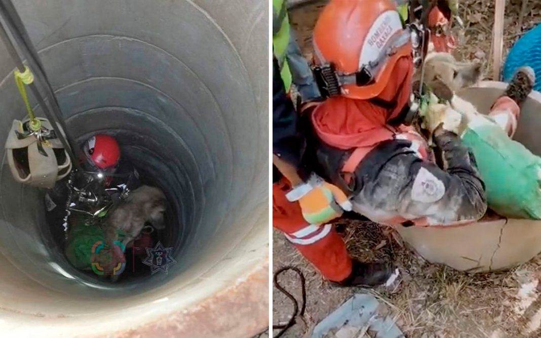Fermín, un lomito de tres años de edad, fue rescatado por elementos del Heroico Cuerpo de Bomberos en San Antonio de la Cal, Oaxaca, tras caer en un pozo y permanecer por varias horas atrapado a más de 20 metros de profundidad.