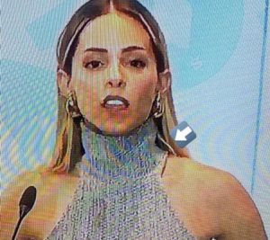 Además, dichos usuarios se cuestionaron el porque la candidata aún al estar a 30 grados usaba una blusa de cuello alto y compartieron capturas de pantalla de lo que parece ser un cable escondido por debajo del cuello de dicha blusa.