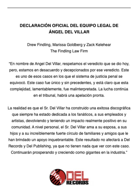 El CEO de la disquera Del Records, Ángel del Villar, fue declarado culpable en un juicio en Estados Unidos por violación de la Ley Kingpin, que sanciona a quienes tienen vínculos con el narcotráfico. Sin embargo, su equipo legal anunció que apelará la decisión, argumentando que el veredicto es un error.