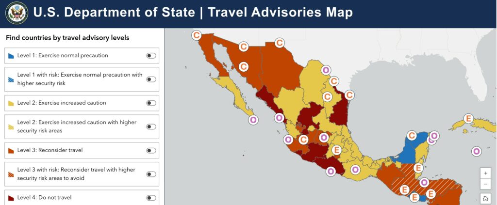 Seis estados —Colima, Guerrero, Michoacán, Sinaloa, Tamaulipas y Zacatecas— se encuentran en el Nivel 4: No viajar, debido a altos índices de violencia. Otros ocho, como Jalisco, Chihuahua y Baja California, están clasificados en Nivel 3: Reconsiderar viajar.