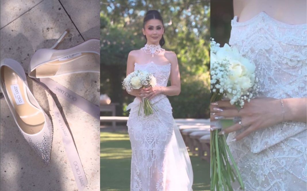 La ceremonia captó la atención no solo por el entorno, sino por el look nupcial de Villalobos. La mexicana lució un vestido de dos piezas compuesto por un corset con escote de tres puntas y una falda corte sirena. En lugar de velo, eligió un collar de piedras blancas que sostenía una larga cola de tul, acompañado de un ramo de rosas blancas y tacones de la firma Jimmy Choo.