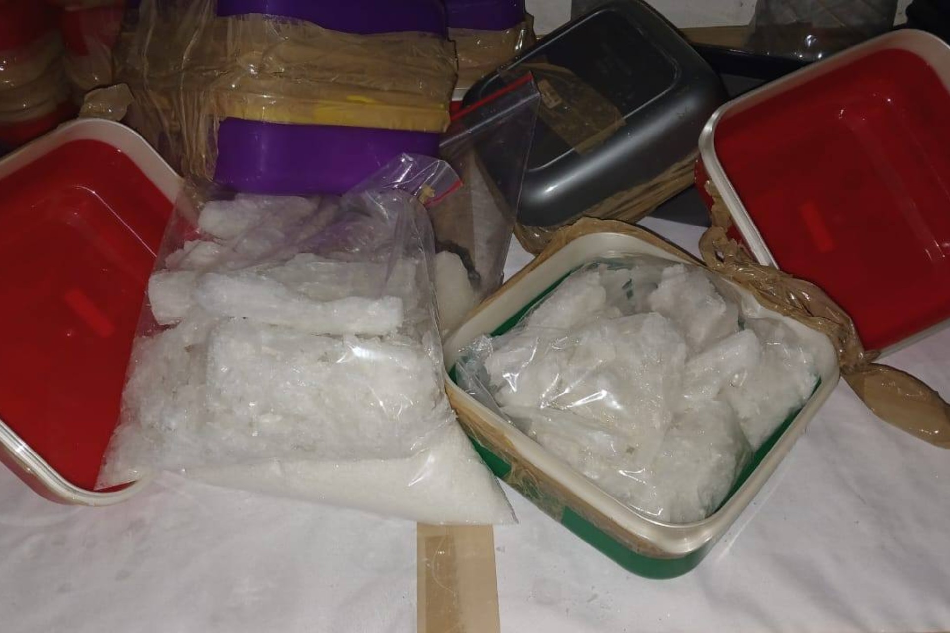 Metanfetamina valorada en más de 350 millones de rands (equivalente a unos 20.2 millones de dólares), empaquetada en loncheras y cubos almacenados en congeladores.