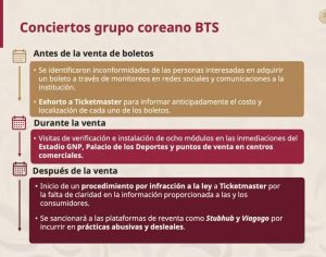 Durante la conferencia matutina de la presidenta Claudia Sheinbaum, la Procuraduría Federal del Consumidor (PROFECO) informó que abrió investigaciones por irregularidades detectadas en la venta de boletos para los próximos conciertos del grupo surcoreano BTS en México. Las indagatorias se derivan de inconformidades expresadas por consumidores y de monitoreos realizados en redes sociales.
