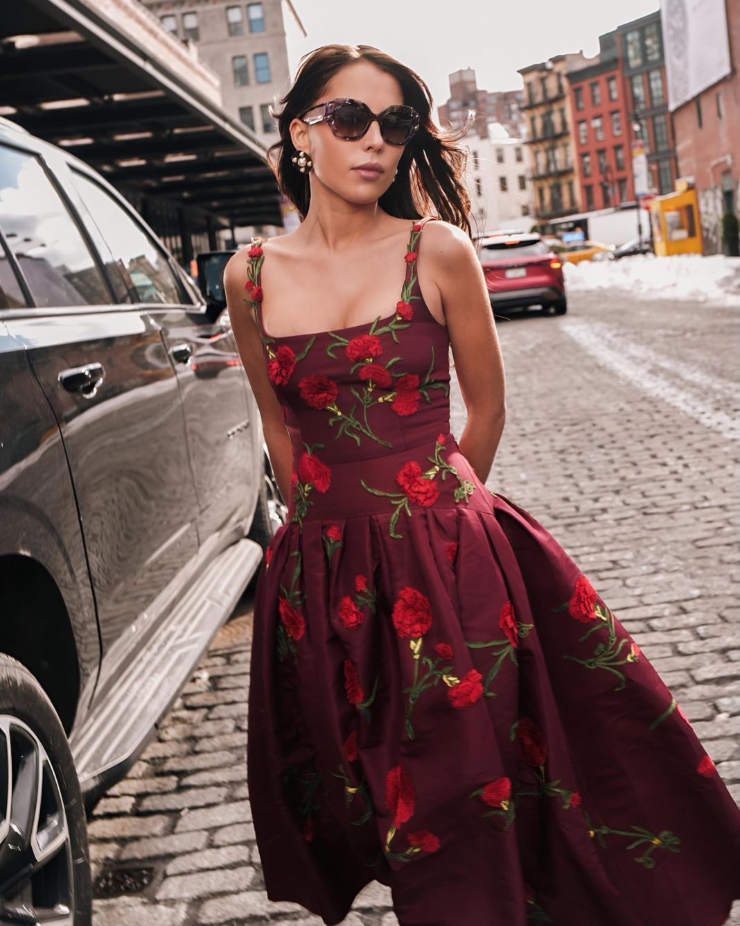 El rojo, color emblemático de la firma, destacó en el look como símbolo de fuerza y romanticismo moderno. Complementado con accesorios vibrantes —bolsa amarilla y calzado metálico— el conjunto proyectó equilibrio entre glamour neoyorquino y esencia latina.