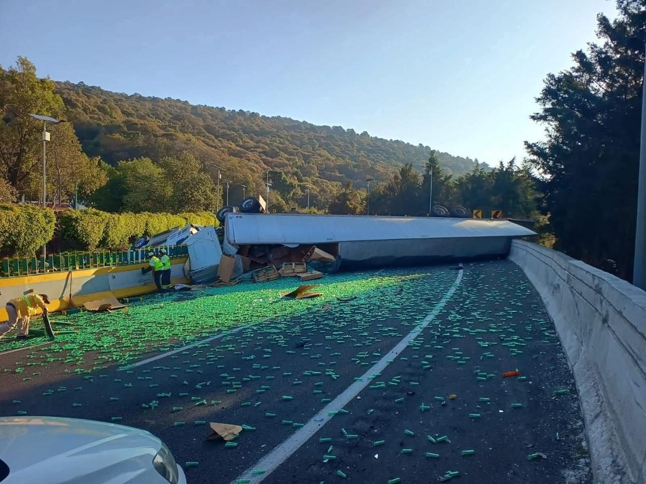 La mañana de este lunes, un tráiler volcó en la autopista México-Cuernavaca, a la altura de la curva conocida como La Pera, provocando el cierre total de la circulación en ambos sentidos y una fuerte afectación vial.