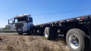 El auto color blanco quedó totalmente destrozado de la parte frontal, mientras que el tráiler tuvo daños mínimos y su remolque quedó atravesado, invadiendo el otro sentido de la carretera.