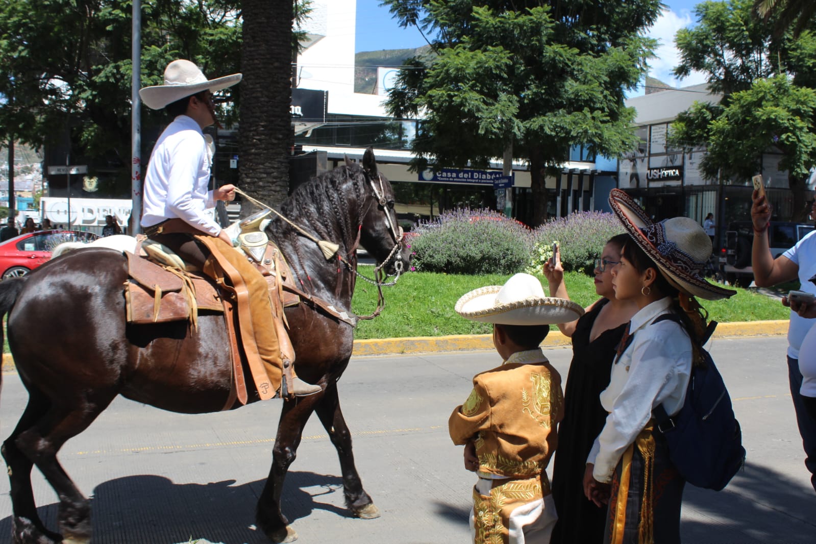 Cuatro jinetes, uno de ellos portando la bandera de México, encabezaron el contingente charro. Adultos mayores, mujeres y hasta niños cabalgaron en yeguas, caballos y ponis por las calles de Revolución, Madero, Plaza Independencia, Guerrero y Avenida Juárez hasta regresar al punto de partida.