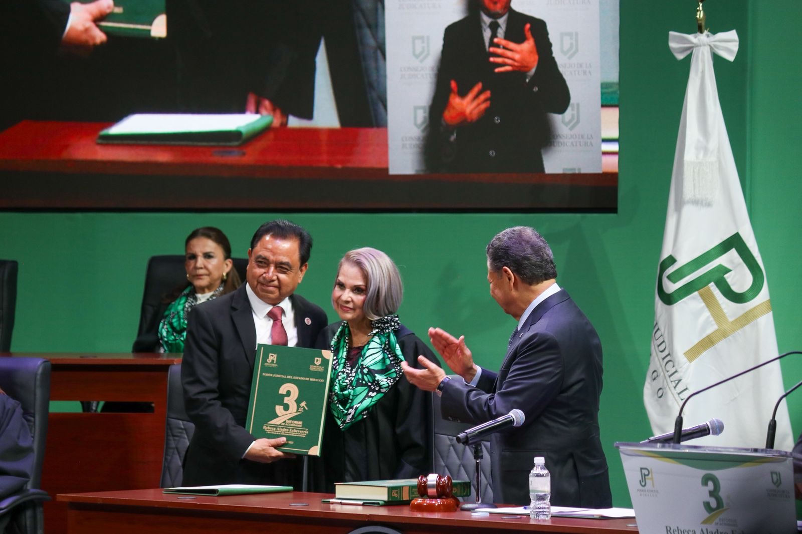 Arropada por integrantes de los tres poderes del estado, así como por funcionarias y funcionarios de los tres niveles de gobierno, la presidenta del Poder Judicial del estado, Rebeca Aladro Echeverría, rindió su tercer informe de labores en el auditorio Gota de Plata de Pachuca.