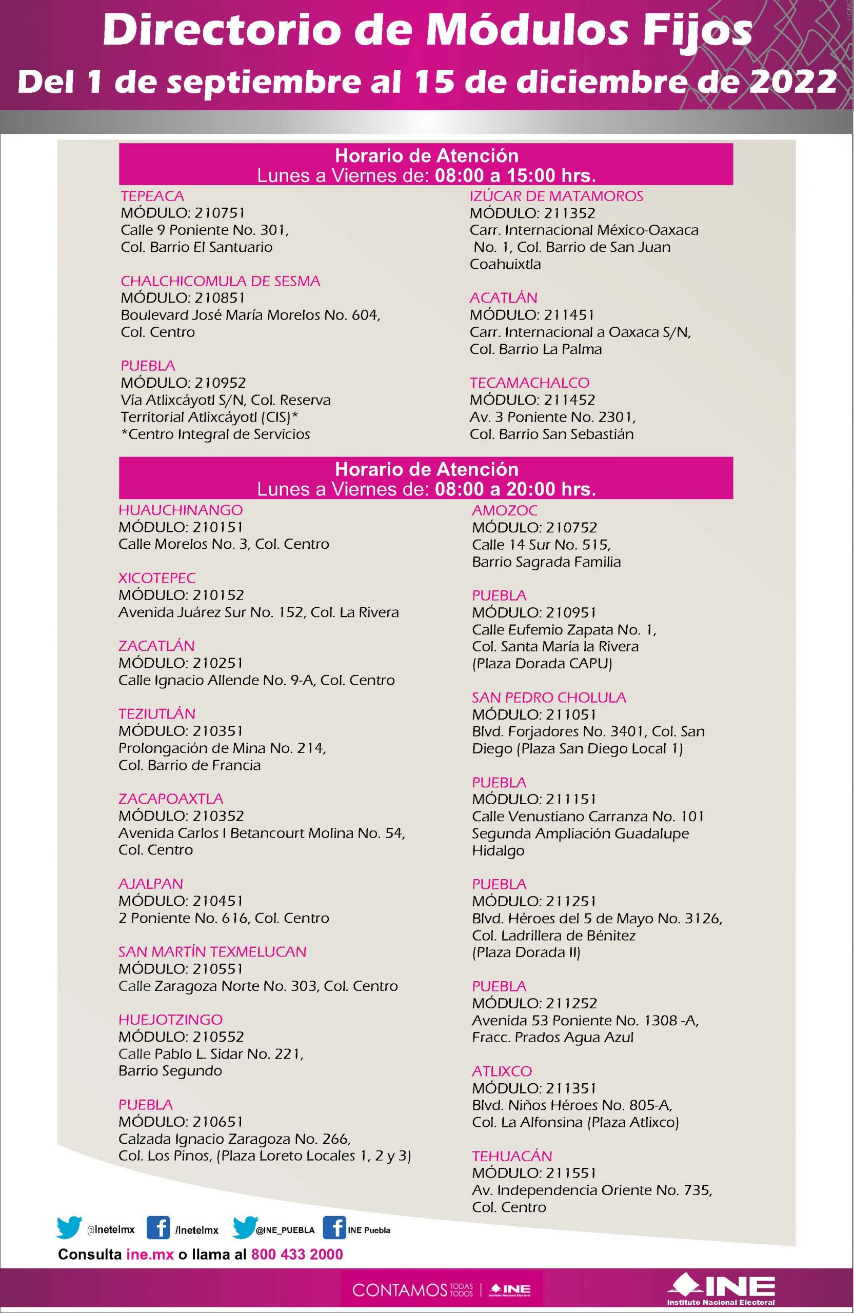 La Junta Local Ejecutiva de Puebla, a través de la Vocalía del Registro Federal de Electores, invitó a la ciudadanía a que acuda a inscribirse en el Padrón Electoral, actualizar sus datos, obtener, renovar o reponer su Credencial para Votar, en cualquiera de los 48 módulos del estado, de los cuales 23 son de tipo fijo, y de estos 17 estarán prestando servicio de 8:00 a 20:00 horas, de lunes a viernes.