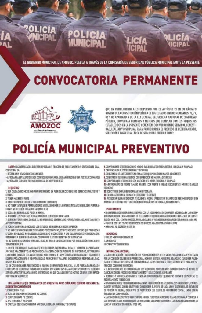 El Gobierno Municipal de Amozoc emitió la convocatoria permanente a hombres y mujeres que cuenten con vocación de servicio, honestidad, lealtad y disciplina con la finalidad de que sean parte del proceso de reclutamiento, selección e integración al área de Seguridad Pública como Policía Municipal Preventivo.