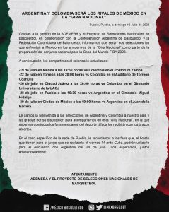 Luego de que Cuba no pudiera presentarse en la Gira Nacional que realiza la Selección Mexicana de Basquetbol, serán Colombia y Argentina los nuevos rivales. Y el juego que se pospuso será este 28 de julio en el Gimnasio Miguel Hidalgo ante Argentina.