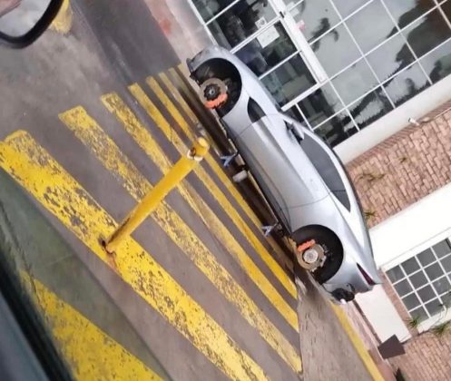 La mañana de este jueves, un automóvil de lujo Aston Martin fue objeto de robo en Palmas Plaza, el vehículo fue despojado de sus cuatro llantas, dejándolo apoyado solamente en un par de tabiques en el estacionamiento del centro comercial.