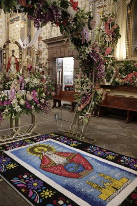 Con profundo fervor religioso y una colorida expresión artística, habitantes de San Andrés Cholula embellecieron el interior de la Parroquia de San Andrés Apóstol como parte de las festividades en honor a la Virgen de los Remedios. Las tradicionales floreras fueron las encargadas de colocar tapetes hechos a mano con aserrín teñido, flores frescas y figuras simbólicas que decoraron el pasillo principal del templo.