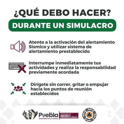 El Gobierno de la Ciudad, encabezado por el presidente municipal Pepe Chedraui, a través de la Dirección de Gestión de Riesgos en materia de Protección Civil de la Secretaría de Gestión y Desarrollo Urbano, reitera la importancia de participar en este ejercicio nacional como parte de la cultura de la prevención, con el fin de estar preparadas y preparados ante situaciones de riesgo. A través del trabajo coordinado entre la ciudadanía y las instituciones, se fortalece la resiliencia de la capital y se construye una ciudad más segura para todas las personas.