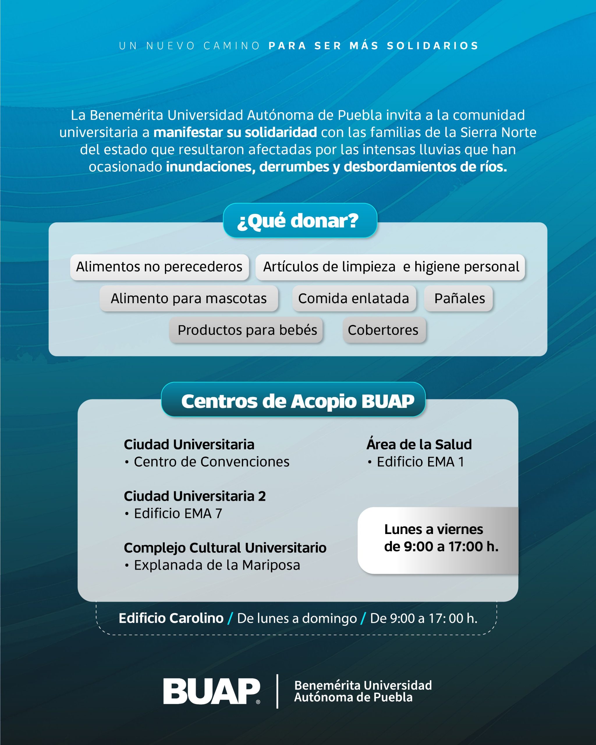 Ante la emergencia ocasionada por las intensas lluvias que han dejado severas afectaciones en comunidades del norte de Puebla y Veracruz, la Benemérita Universidad Autónoma de Puebla (BUAP), la Universidad Popular Autónoma del Estado de Puebla (UPAEP) y la Universidad Anáhuac Puebla unieron esfuerzos para lanzar una campaña solidaria en apoyo a las familias damnificadas.