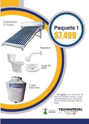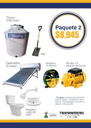 Dentro de esta estrategia se encuentra el paquete de tinaco, de mil 200 litros, un calentador solar de doce tubos, regadera y juego de baño por siete mil 499 pesos, además un segundo paquete con tinaco de mil 200 litros, calentador solar de quince tubos, bomba de medio caballo de fuerza, juego de baño, una pala y manguera por ocho mil 945 pesos.