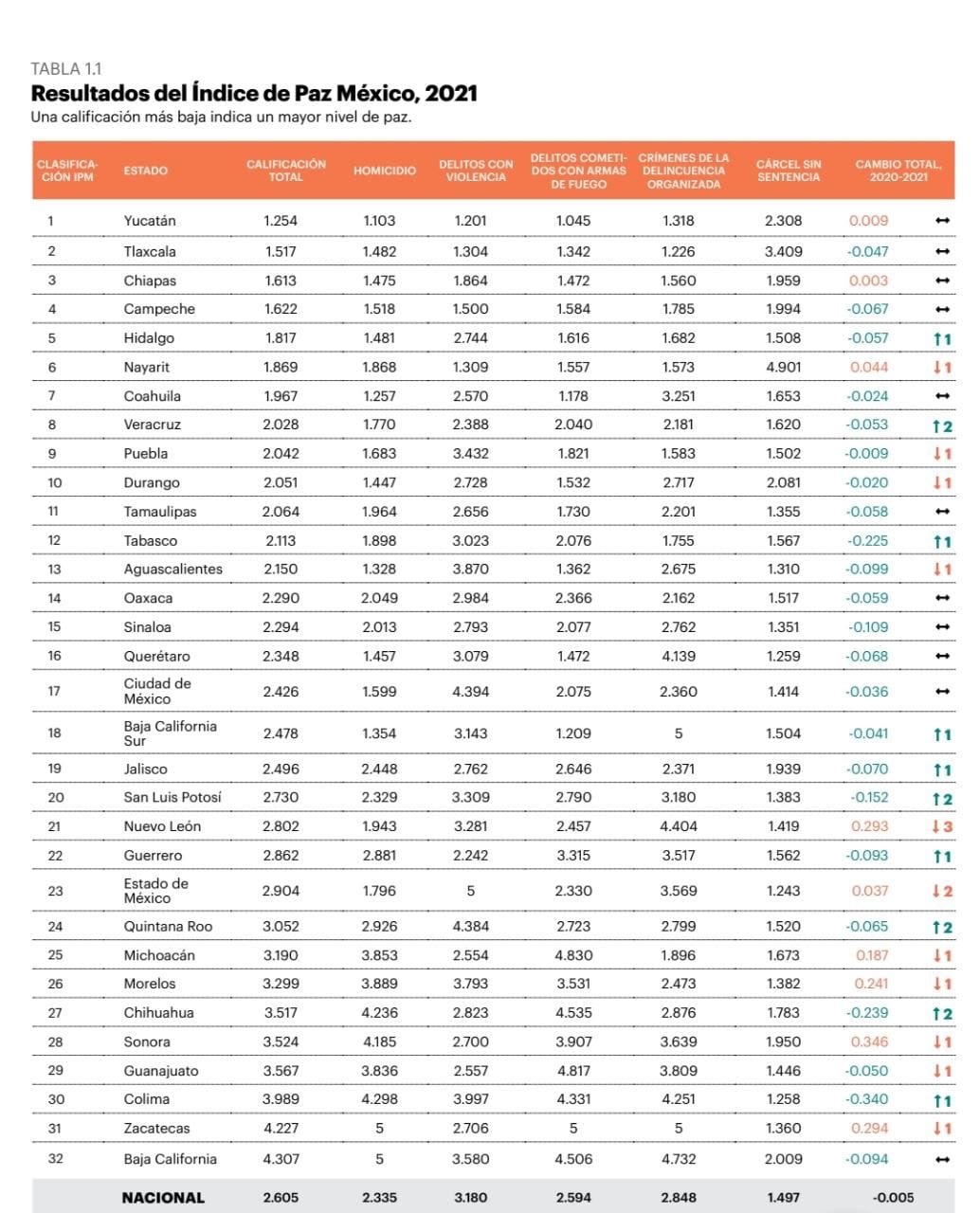 El estado de Tlaxcala se mantiene como una de las cinco entidades más pacíficas del país, de acuerdo con el Índice de Paz México (IPM) 2022, elaborado por el Instituto para la Economía y la Paz (IEP). La entidad se ubica en segundo lugar, por debajo de Yucatán y arriba de Chiapas, Campeche e Hidalgo.