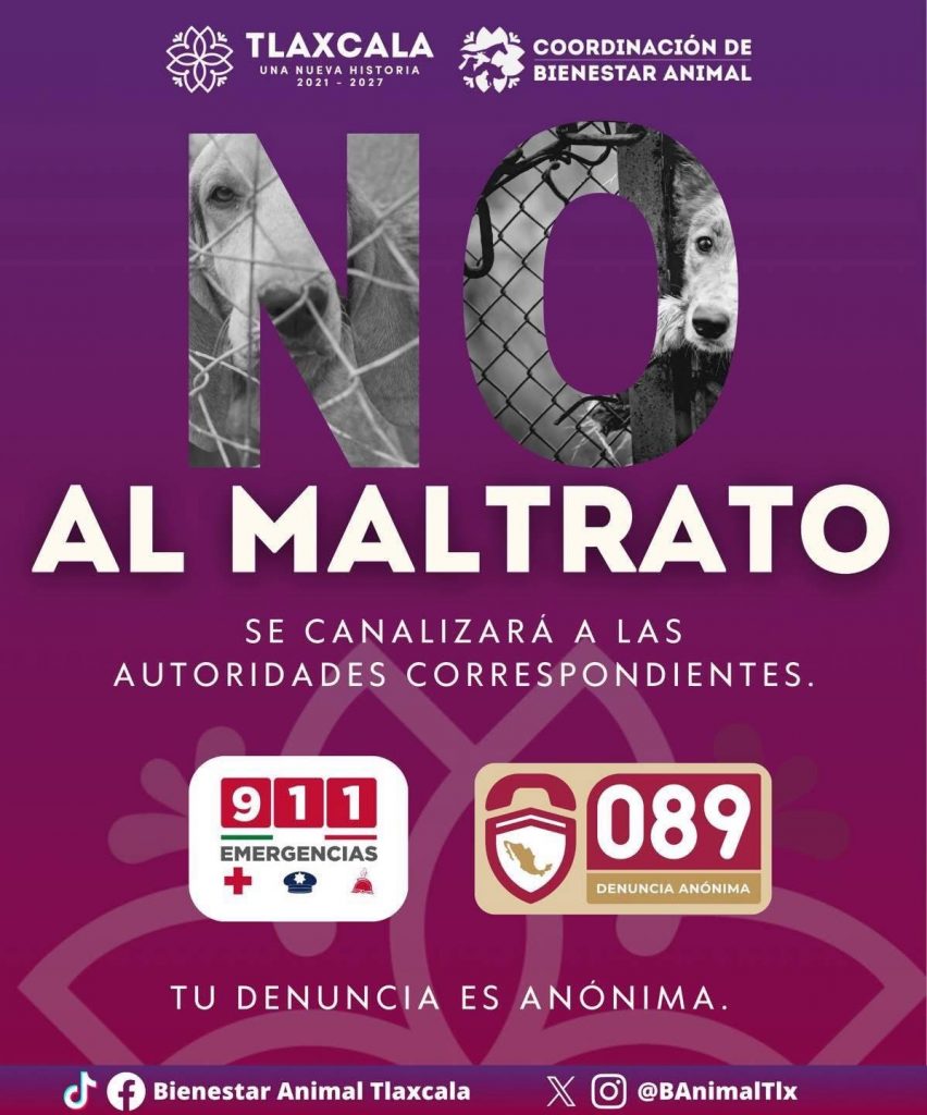 La CBA de Tlaxcala invita a la ciudadanía a denunciar cualquier acto de maltrato o crueldad animal. Las denuncias son completamente confidenciales y pueden realizarse anónimamente a los números 089 y 911.